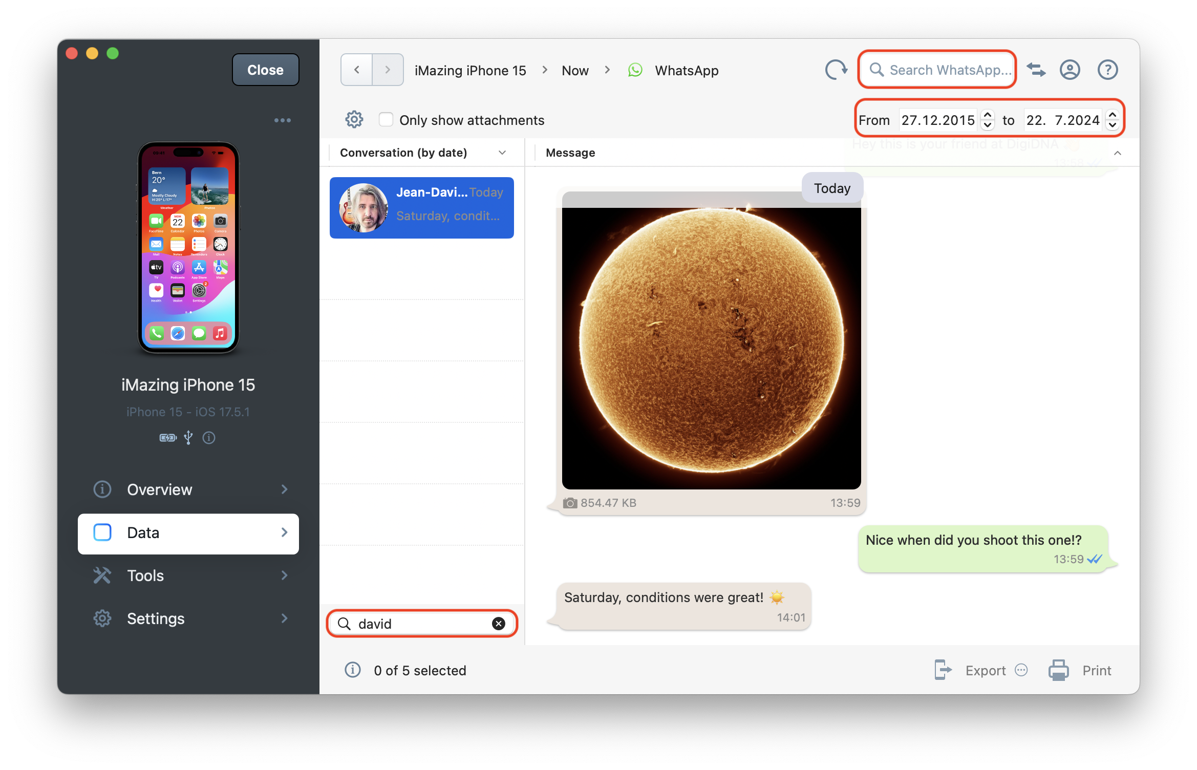 iMazing's WhatsApp view offers date range filters and text search fields designed to help you find and recover content quickly.