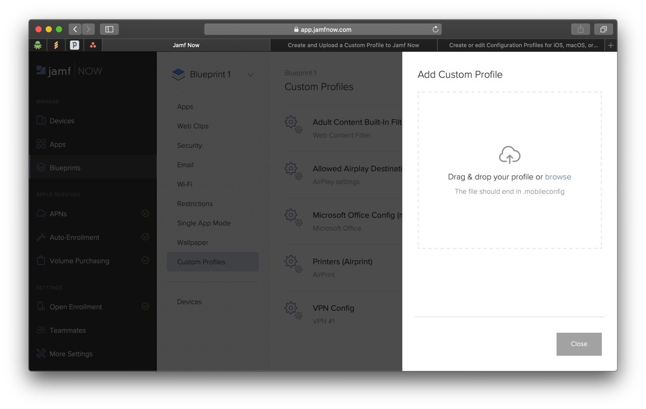 Jamf Now's dashboard lets you configure a curated set of macOS, iOS, iPadOS and tvOS settings. It's important to understand that behind the scenes, Jamf servers will actually coalesce these settings into what is called a Configuration Profile, an Apple file format bearing the .mobileconfig extension. These profiles are then deployed automatically to your enrolled mobile devices. If you've opted for Jamf Now's Plus plan, you'll also have the option to upload a custom configuration profile to your Jamf blueprints, thereby getting access to a plethora of settings that aren't exposed directly in Jamf Now's dashboard: