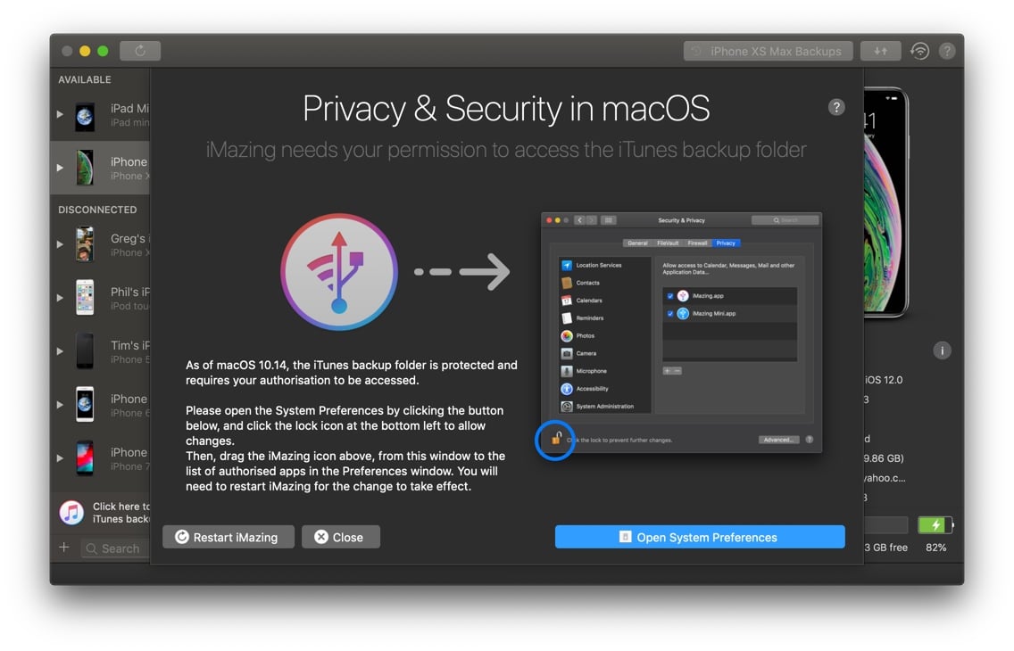 - Click the Open System Preferences button, and iMazing will open System Settings at the right spot: Security & Privacy, Privacy tab, Full Disk Access whitelist: