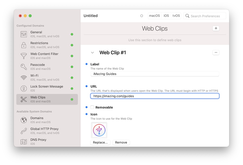 You can add a link to any website right there on the device's home screen, as if it were an app. Tapping the web clip 'app' will open Safari at the configured URL. Below, we're configuring a web clip which will point to iMazing's Guides page.